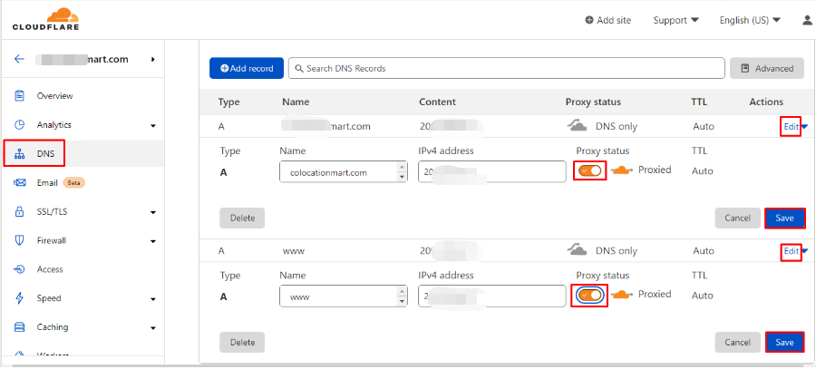 On cloudflare client panel, enable proxy status for your two domain DNS records, then save the changes.