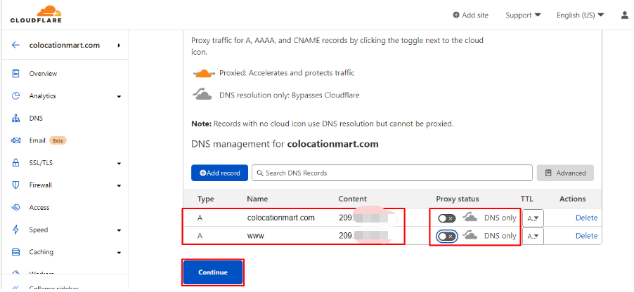 Add the two DNS A records. Then, enable the DNS only mode for your domain and make sure the Proxy status is disabled.