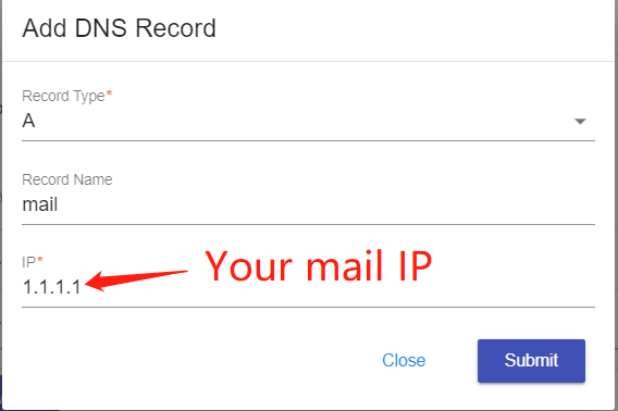 Before you create the MX record, an A record for the mail domain --"Record Name: mail; IP: Your mail IP" in this example -- should be created first.