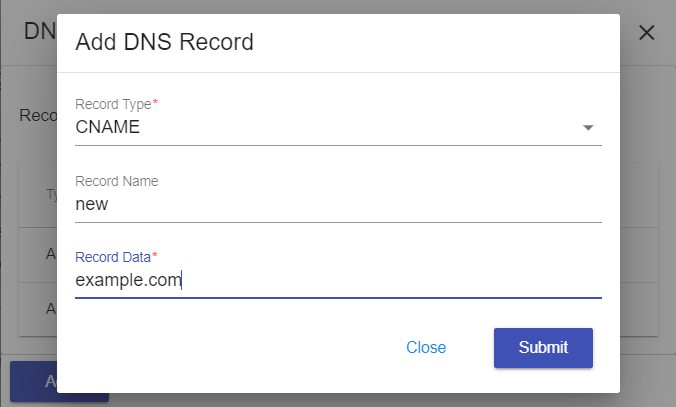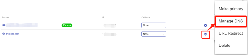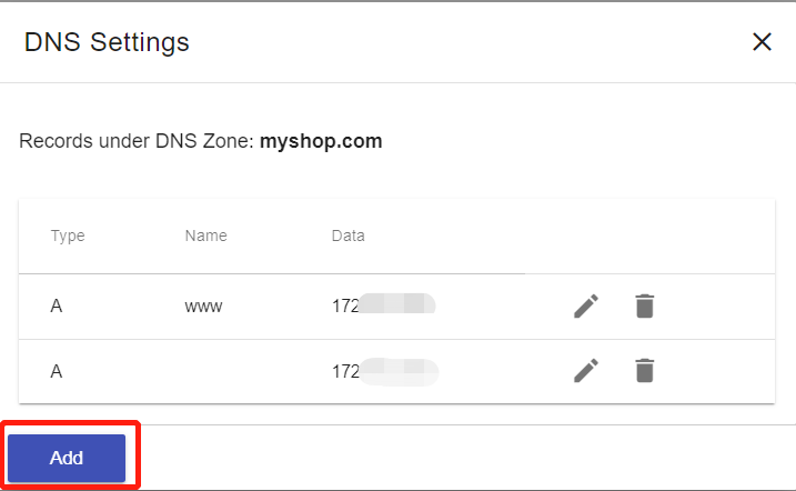Click the icon at the end of the domain you just added, followed by clicking "Manage DNS". The DNS Settings dialog box will appear.