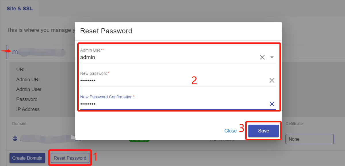 Locate the site, followed by clicking "Reset Password". Then reset the admin user password and save it.
