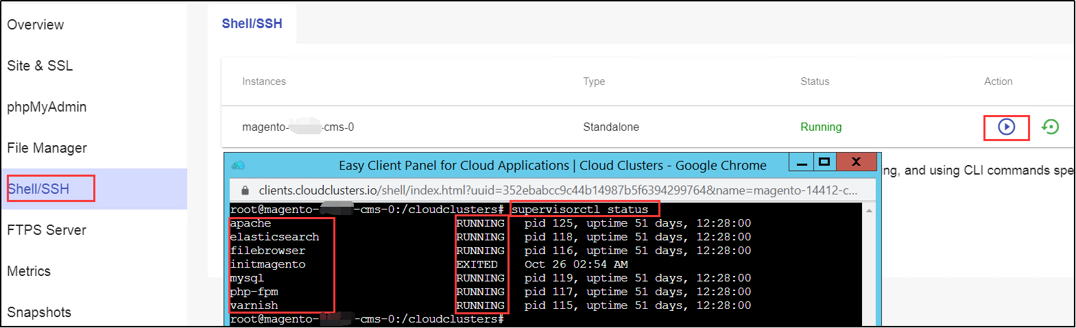 • Check if processes, like apache, php-fpm, and mysql, are running normal by running the command “supervisorctl status” via shell interface. The processes are working just fine if the result is as the following screenshot shows.