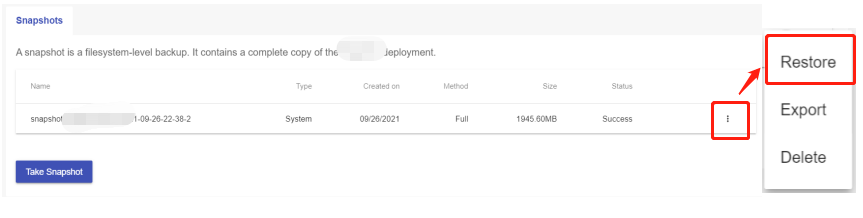 Click the "Manage" button on the Home page or the My Applications pgae, followed by the “Snapshots” tab. You will be shown a list of backup files.