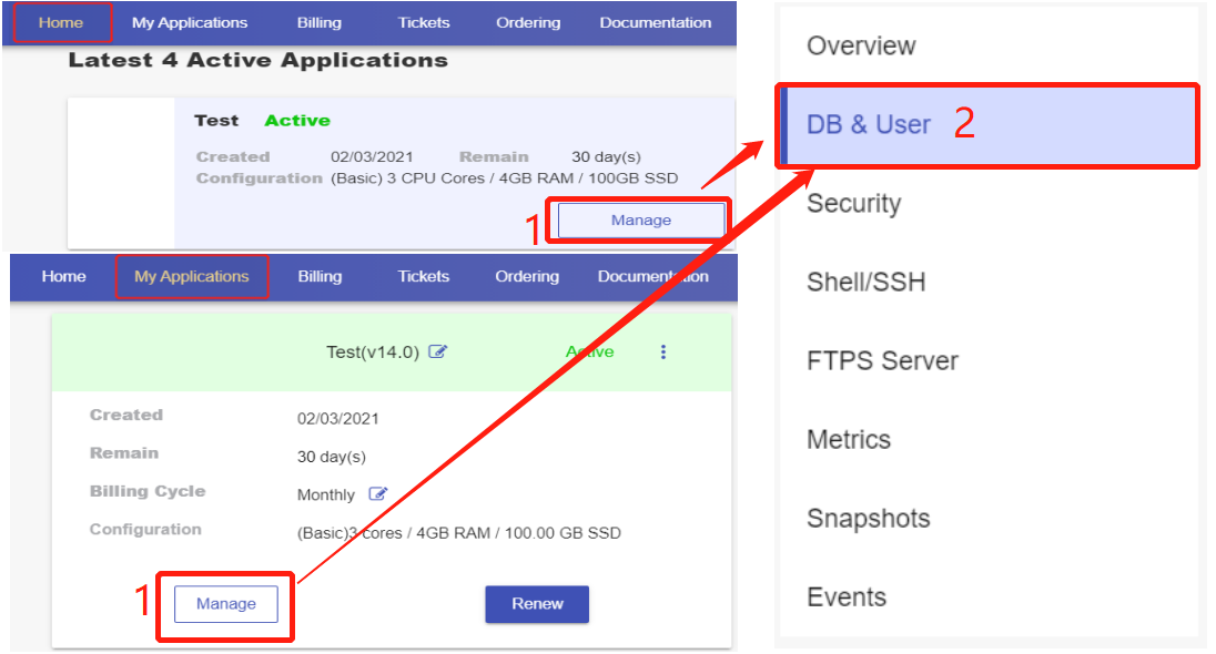If there is not any database or user, create the database and user first. Click the "Manage" button on the Home page or the My Applications page. Then Click the “DB & User” tab in the menu bar on the left. On the page, you can create your databases and users.