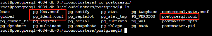 Enter the command “cd postgresql/”, followed by the command “ls” to check the files under the directory. You can see the configuration files for PostgreSQL: pg_hba.conf, pg_ident.conf, postgresql.conf