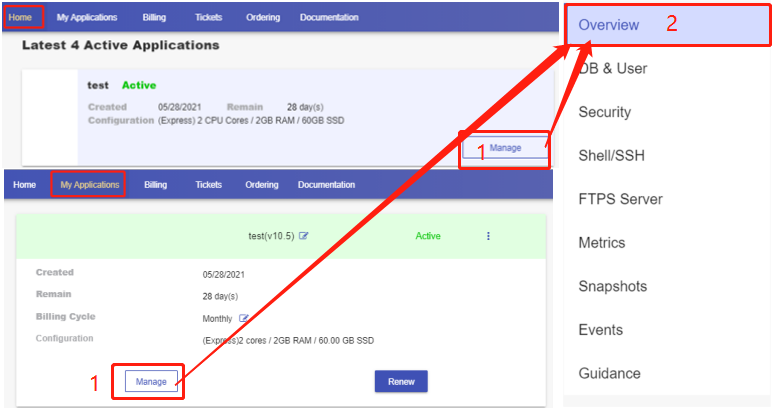 Click the "Manage" button on the Home page or the My Applications page to go to the Overview page.